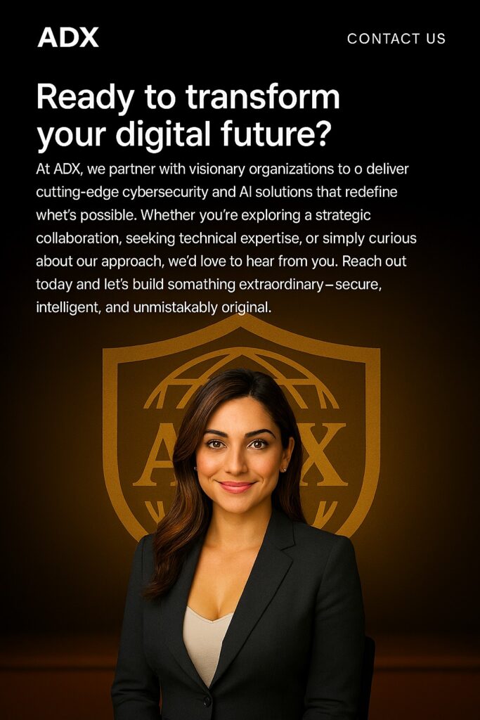 At ADX, we partner with visionary organizations to deliver cutting-edge cybersecurity and AI solutions that redefine what’s possible. Whether you’re exploring a strategic collaboration, seeking technical expertise, or simply curious about our approach, we’d love to hear from you. Reach out today and let’s build something extraordinary—secure, intelligent, and unmistakably original.